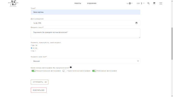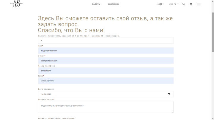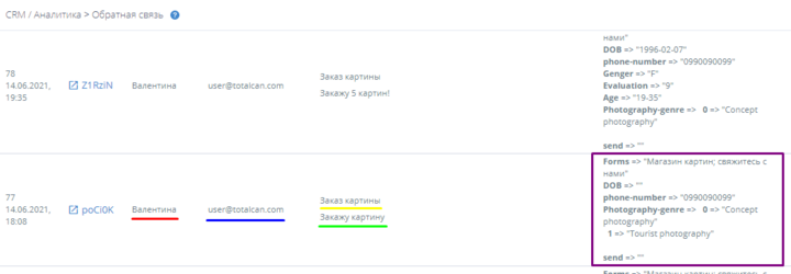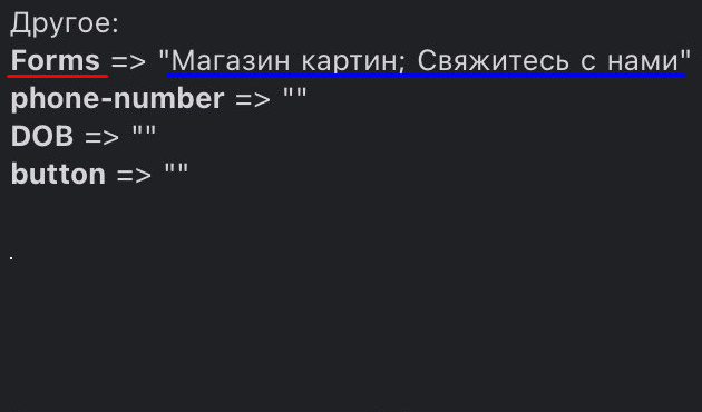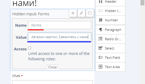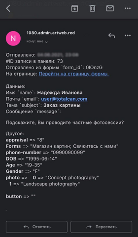 Здесь, внизу, в "Другое:" нам пришло Name - Forms и Value - Магазин картин; свяжитесь с нами.