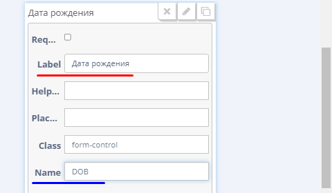 Заполняем уже знакомое поле Label; Required (обязательный), Help (Помощь) и Placeholder (Заполнитель) - заполняем по желанию.