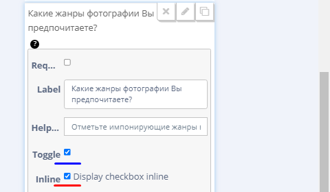 Теперь, в админ-панели, поставим отметки возле Toggle и Inline.