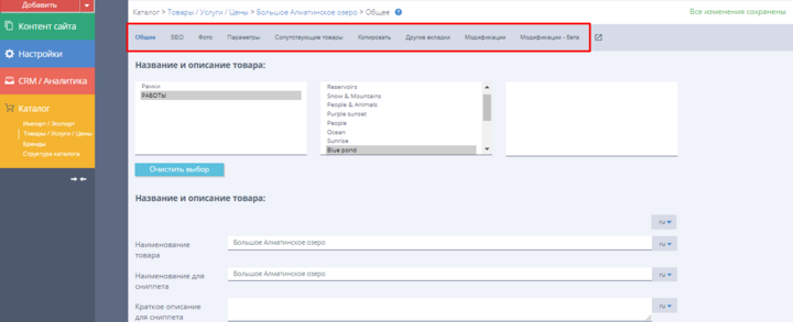 Табами навигации называются те поля, которые обведены красным прямоугольником. Они присутствуют в редактировании любой страницы или товара.