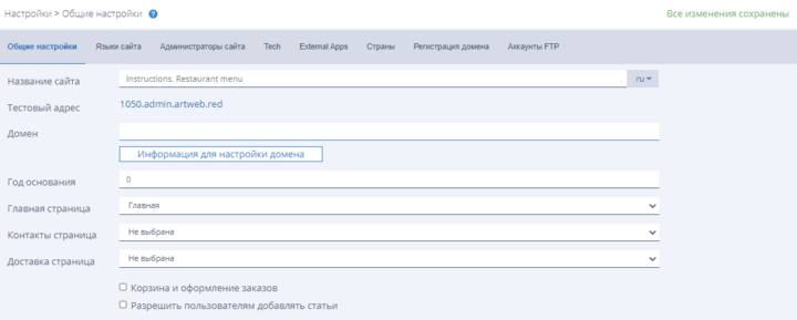 Так же здесь вводится домен, который можно зарегистрировать в табе навигации Регистрация домена.