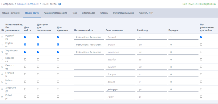 В табе навигации Языки сайта необходимо выбрать языки, на которых администратор будет заполнять сайт, поставив галочки в нужных графах.